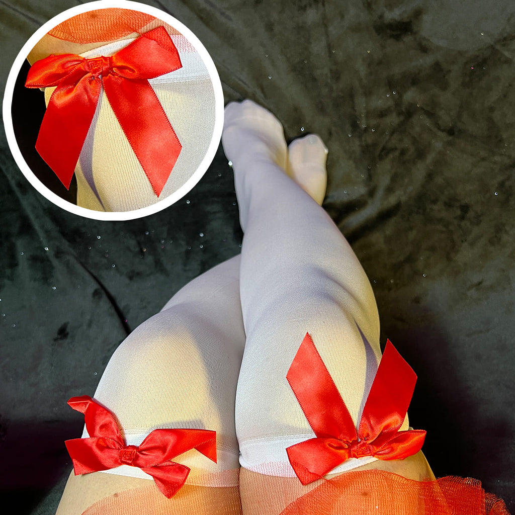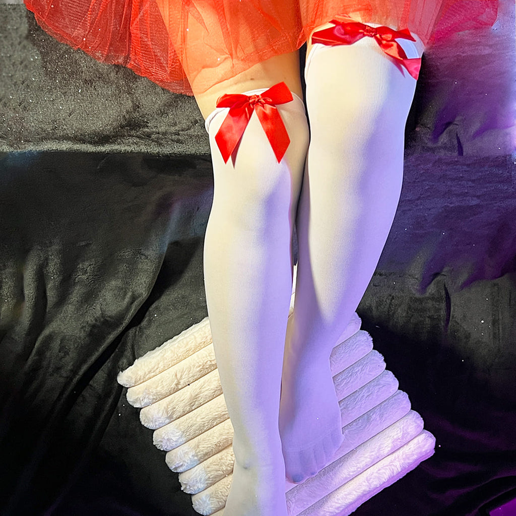 Medias largas blancas con moños rojos 🎀. Ideales para cosplay, Halloween, fiestas y disfraces coquetos 🎭.